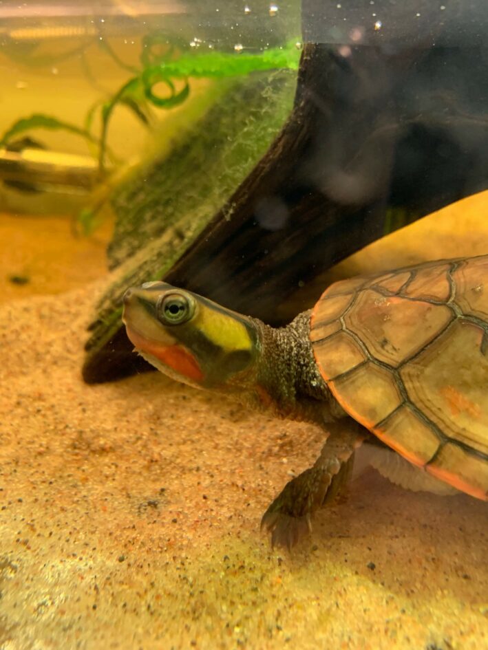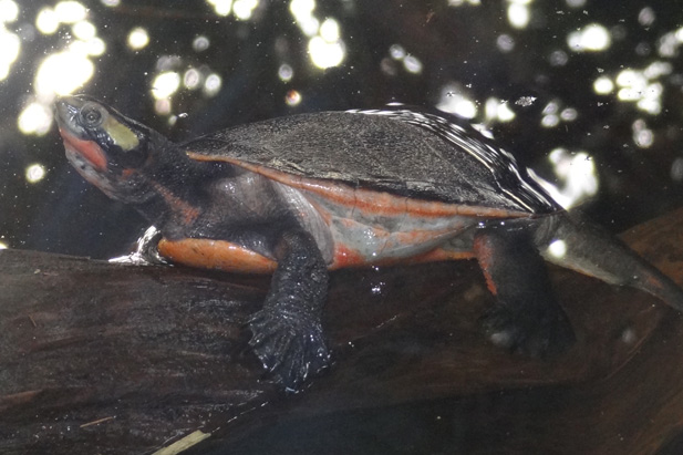 Den rödbukade vändhalssköldpaddan kännetecknas av sin färgglada undersida och färgen kan skifta i orange, gult, rött och rosa. Precis som andra sötvattenssköldpaddor alternerar de perioder i vattnet med solbad för att reglera kroppstemperaturen.